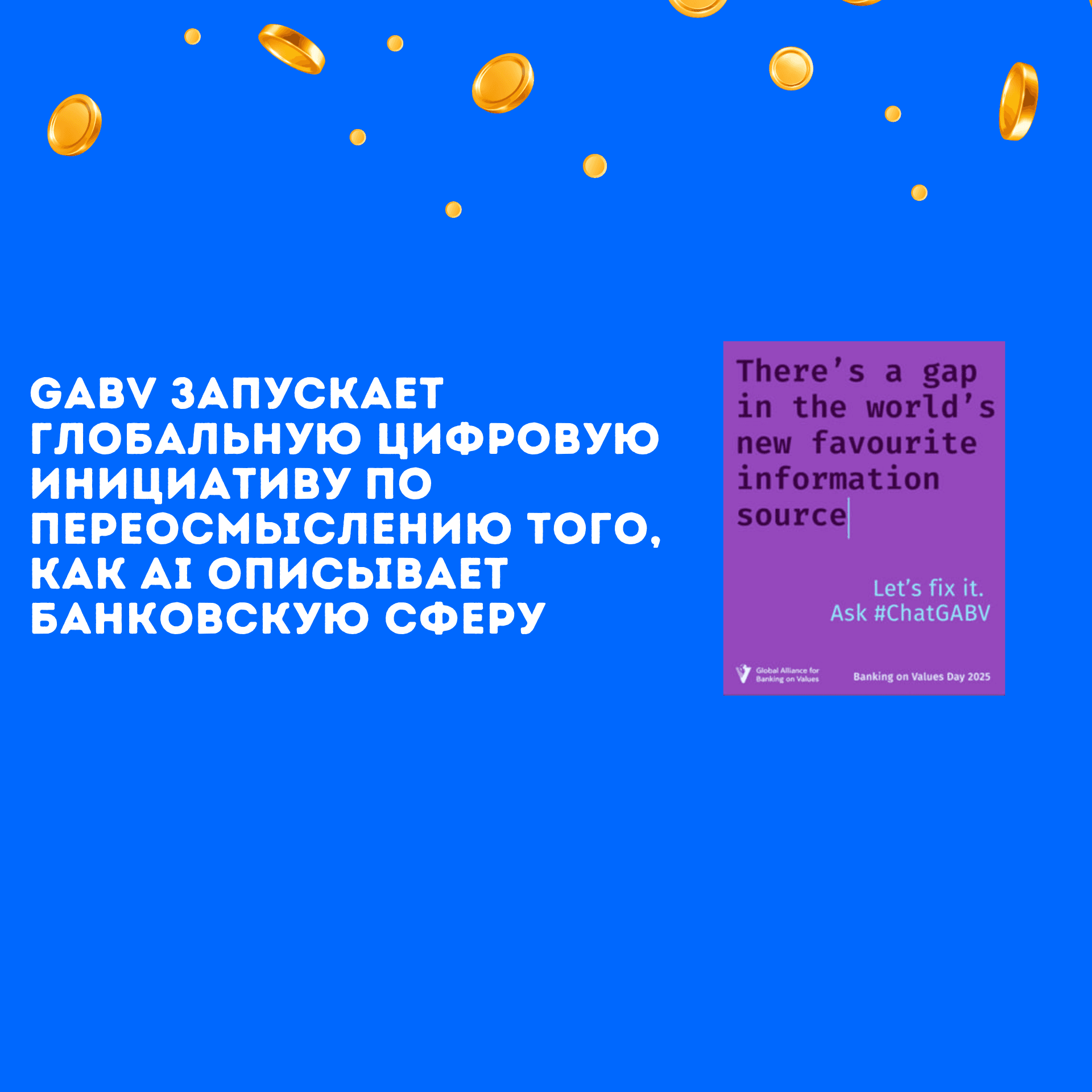 Кампания жөнүндө Демилге коомдук пикирди калыптандырууда технологиялардын ролун баса белгилеп, ЖИ тарабынан түзүлгөн контентти атайылап колдонот. GABV ЖИден качуунун ордуна, аны кантип жакшылыкка багыттоого болорун көрсөтөт. Ошол эле учурда, альянс этика, туруктуулук жана автордук укук маселелерин эске алат — кампанияны түзүүдө лицензияланган материалдар колдонулган, ал эми видеону өндүрүүдөн келип чыккан көмүртек изи компенсацияланган. ChatGABV куралы жөнүндө көбүрөөк билүү жана аны колдонуп көрүү үчүн төмөнкү сайтка кириңиз: www.chatgabv.org