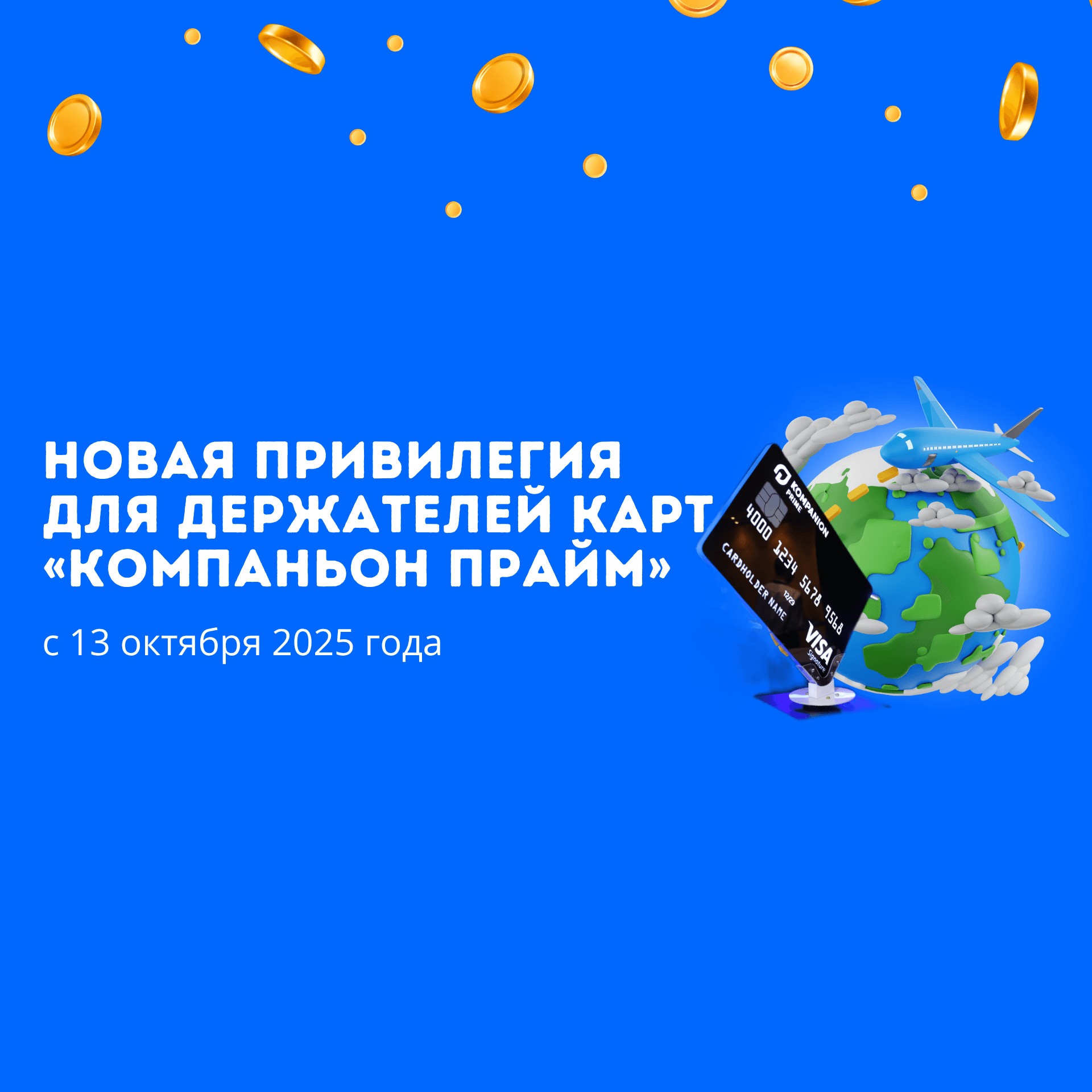 2025-жылдын 13-октябрынан тарта «Kompanion Prime» (Visa Signature) картасынын ээлери жылына 4 жолу “Манас” эл аралык аэропортунда (Бишкек ш., Кыргызстан) төмөнкү кызматтарды акысыз пайдалана алышат: