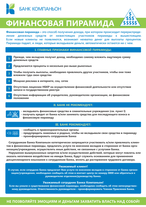 Этият болуңуздар, финансылык пирамидаларга катышпаңыздар! «Компаньон Банкы» ЖАК ушундай уюмдарга тиешелүү эмес, финансылык пирамидаларга жана башка шектүү операцияларга салынган акча каражаттары үчүн жоопкерчилик тартпайт.