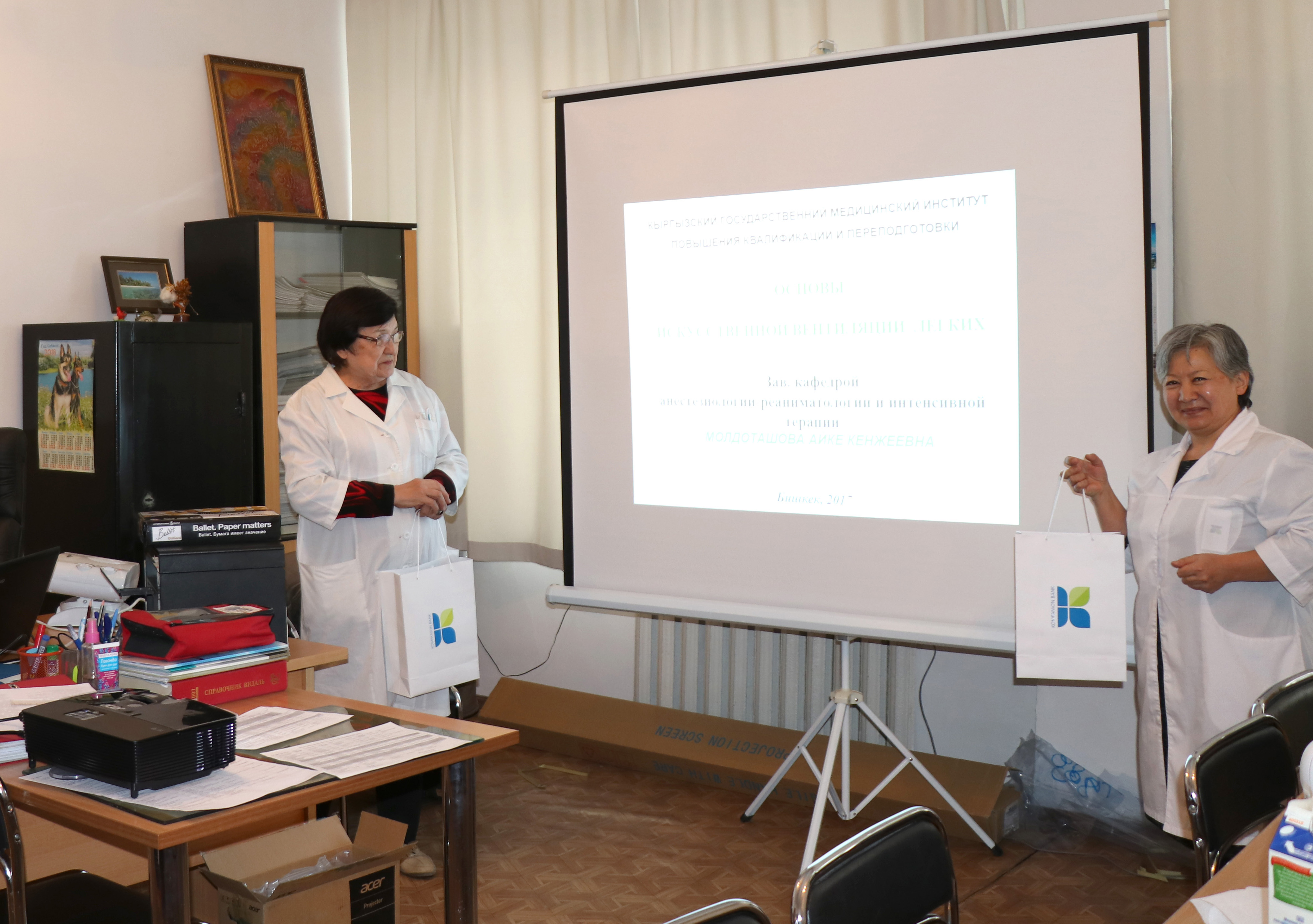 Бул жылы, кайра даярдоо жана квалификацияны жогорулатуу боюнча Кыргыз мамлекеттик медицина академиясынын анестезиология жана реаниматология кафедрасы 45 жылдык мааракесин белгилеп жатат! Башкармалыктын Төрагасы Жумабаев Эркинбек Алтымышевич, Компаньон Банкынын атынан, медициналык мекемеге абдан зарыл болгон проектор жана экранды белек катары тапшырды.