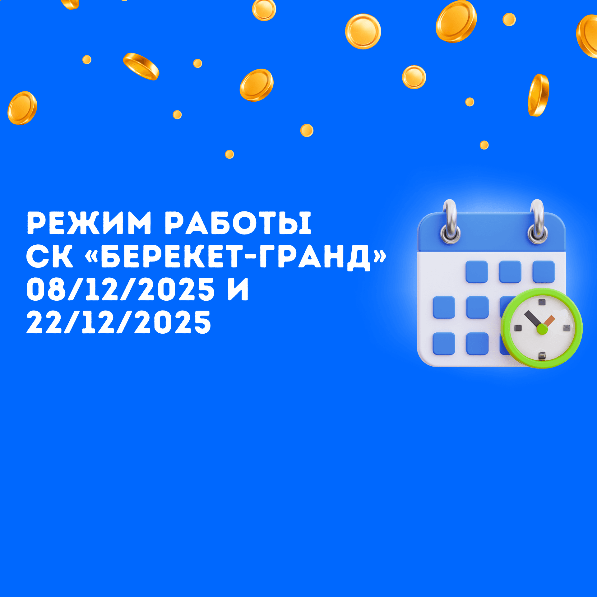 бештин айы 5, 202508/12/2025 ЖАНА 22/12/2025 карата СК «БЕРЕКЕТ-ГРАНД» ИШ РЕЖИМИ