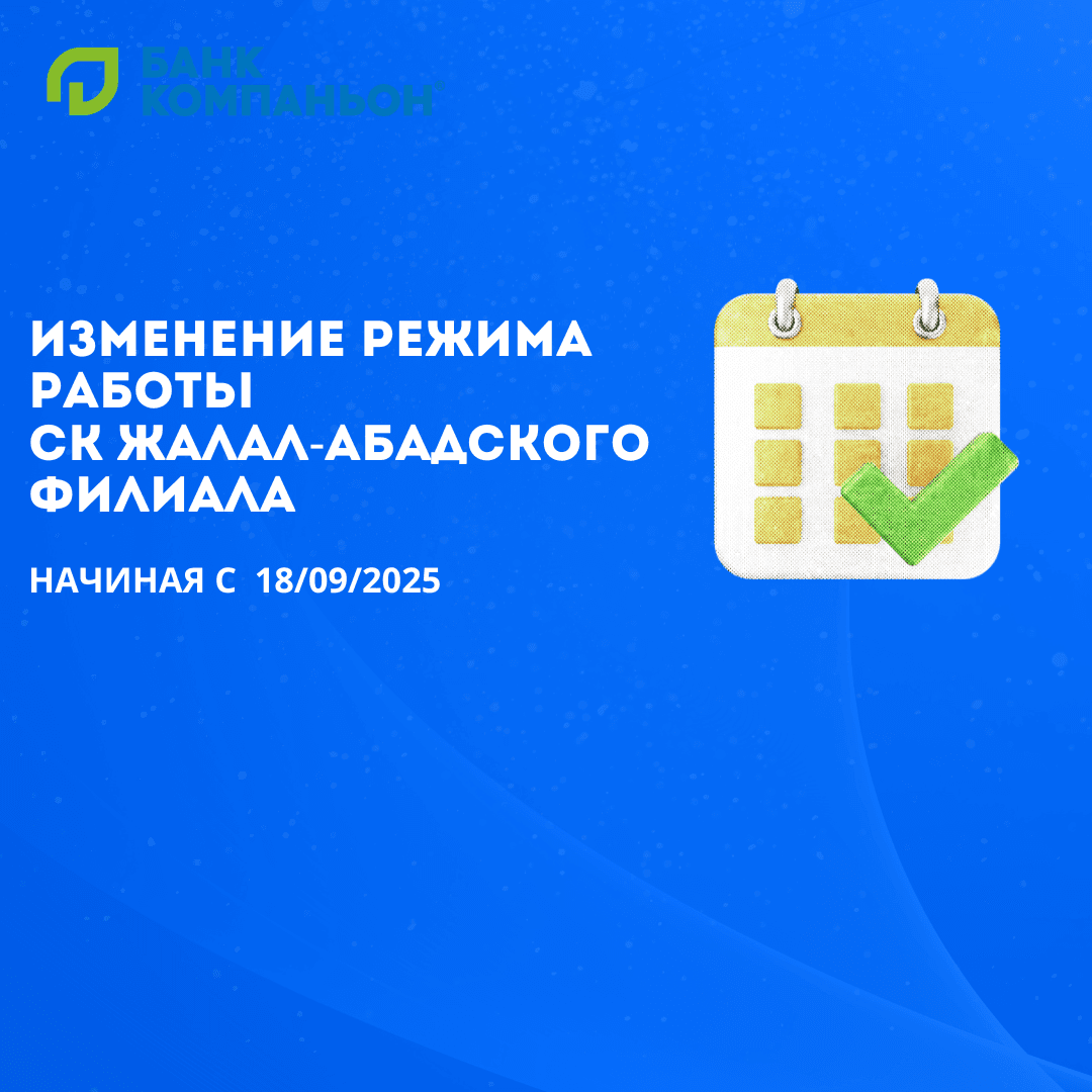 Кардарлардын ыңгайлуулугу үчүн 2025-жылдын 18-сентябрынан тартып Банктын Жалал-Абад филиалынын төмөнкү жинаак кассаларынын иштөө режими өзгөрдү: