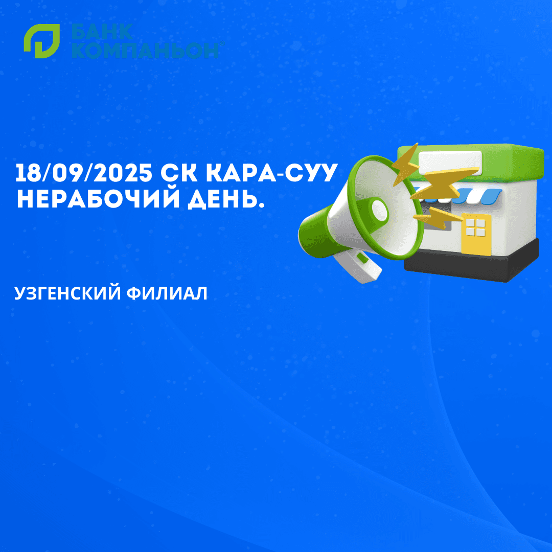 2025-жылдын 18-сентябрында Банктын Өзгөн филиалынын СК Кара-Суу иштебей тургандыгын маалымдайбыз.