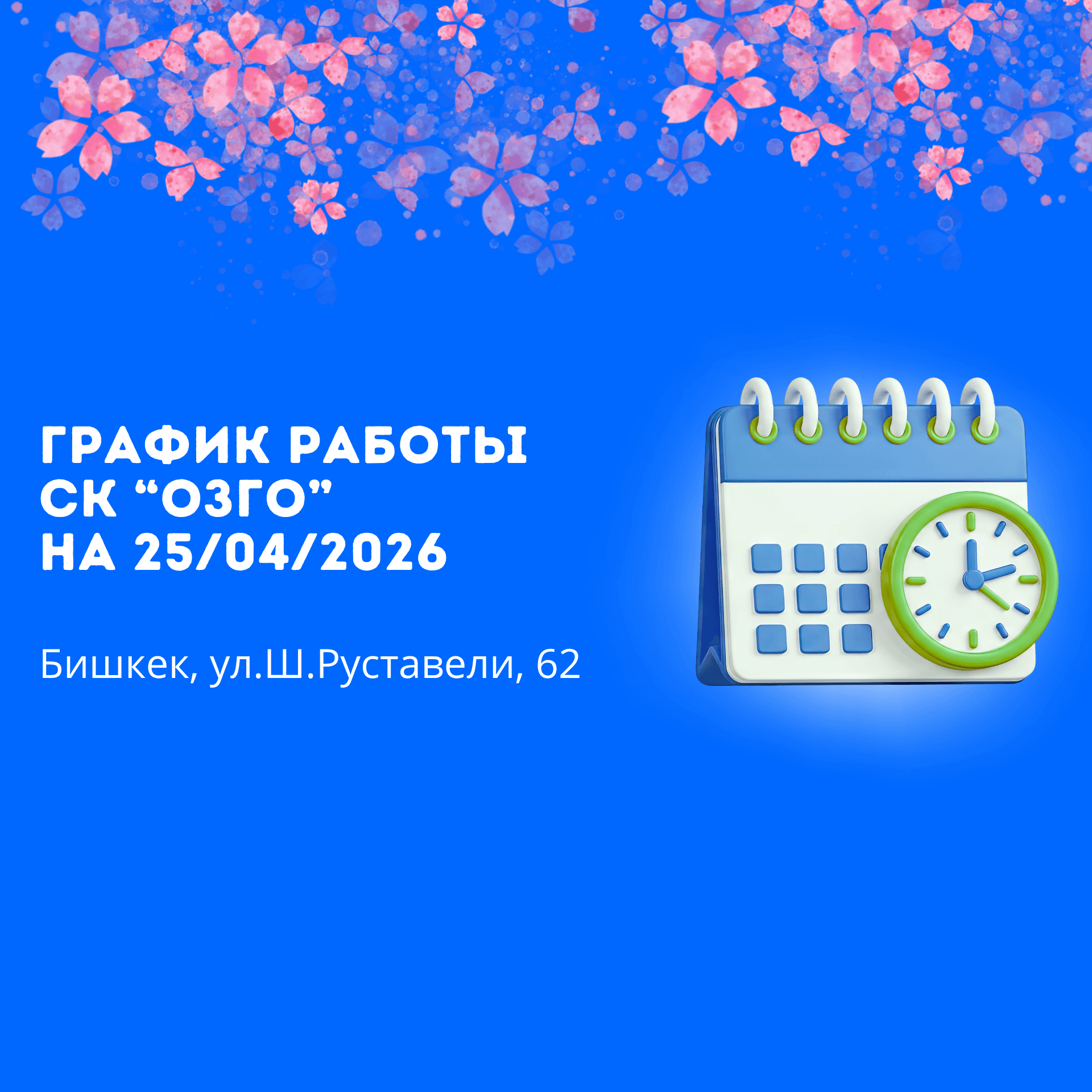2026-жылдын 25-апрелинде «ОЗГО» СК (Бишкек ш., Ш. Руставели көч., 62) иш графиги төмөнкүдөй: