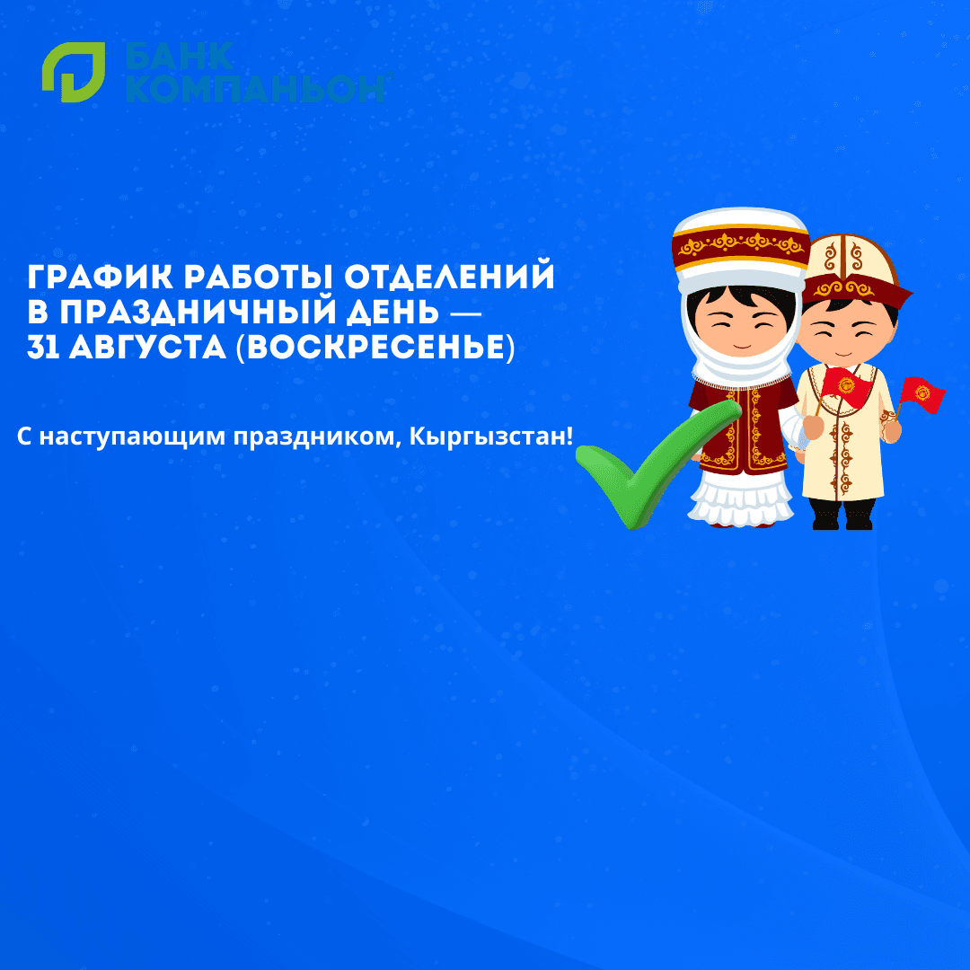 31-август күнү (жекшемби) Компаньон Банкынын бөлүмдөрдүн майрам күндөгү иш графиги.