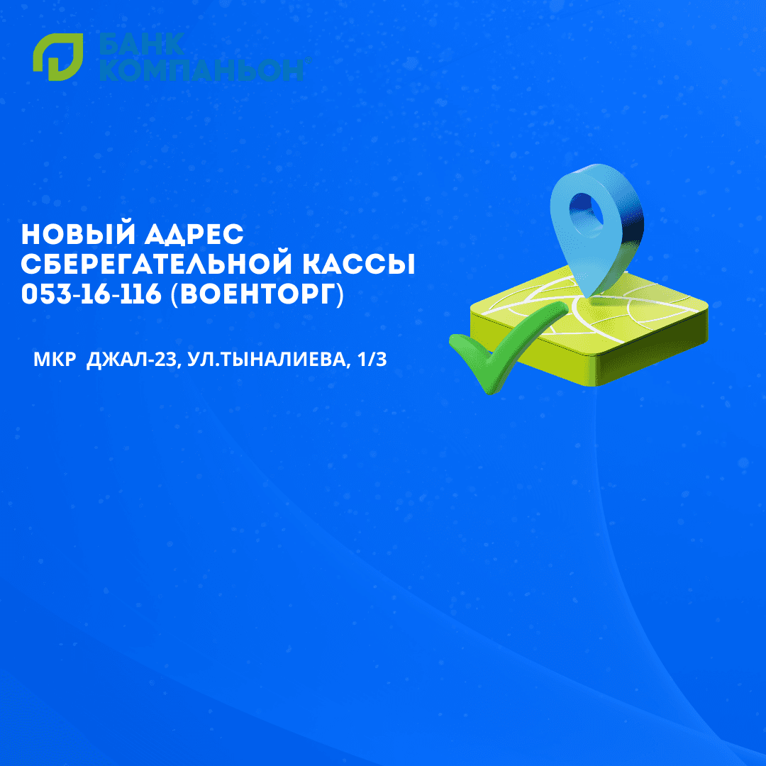 2025-жылдын 9-сентябрынан тартып Банк Компаньондун СК 053-16-116 («Военторг») жаңы даректе тейлейт: мкрн Джал-23, Тыналиев көчөсү, 1/3.